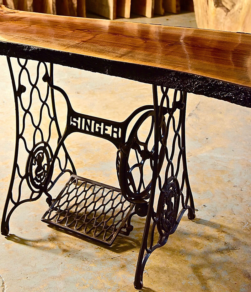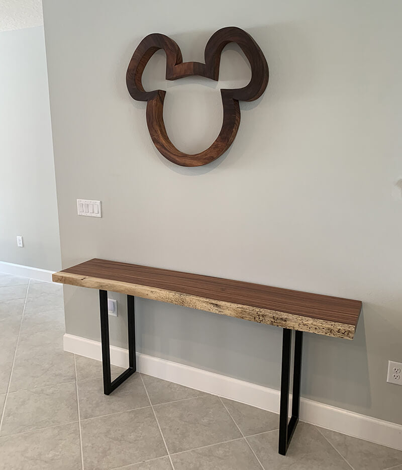 This is a graceful Monkeypod console table with rectangular metal base. Perfect for entryway or foyer.