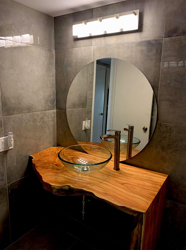 This splendid waterfall vanity is made of a Floridian hybrid of Rosewood and Mahogany. It’s a very heavy and dense wood with a unique pattern which provides a stunning and natural focal point.